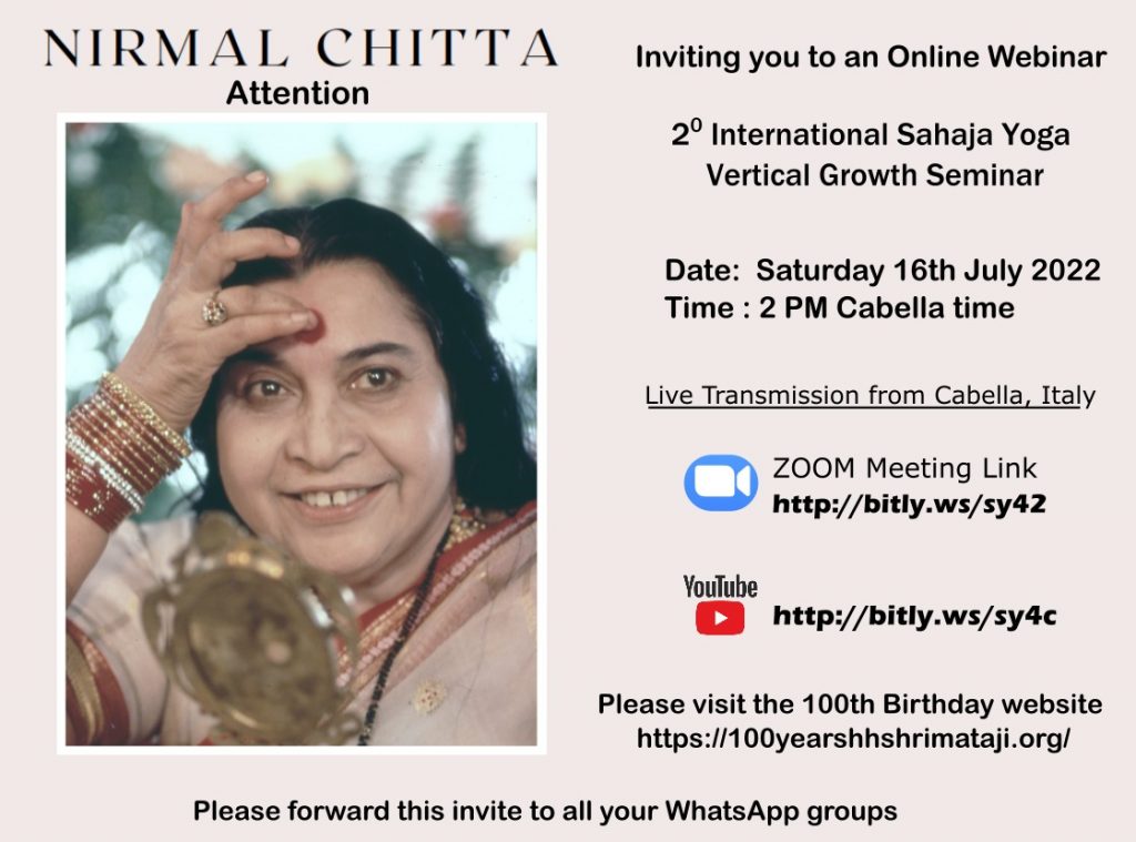 In celebration of Our Divine Mother, Shri Mataji Nirmala Devi’s 100th Birthday, we wish to humbly offer Her our own personal gift of vertical growth. Our desire is to grow deeper in Sahaja Yoga and to deepen our axis and our state of meditation. Also to develop and sustain our spiritual values and our vibratory awareness to enable us to reach the blissful state of Nirananda.