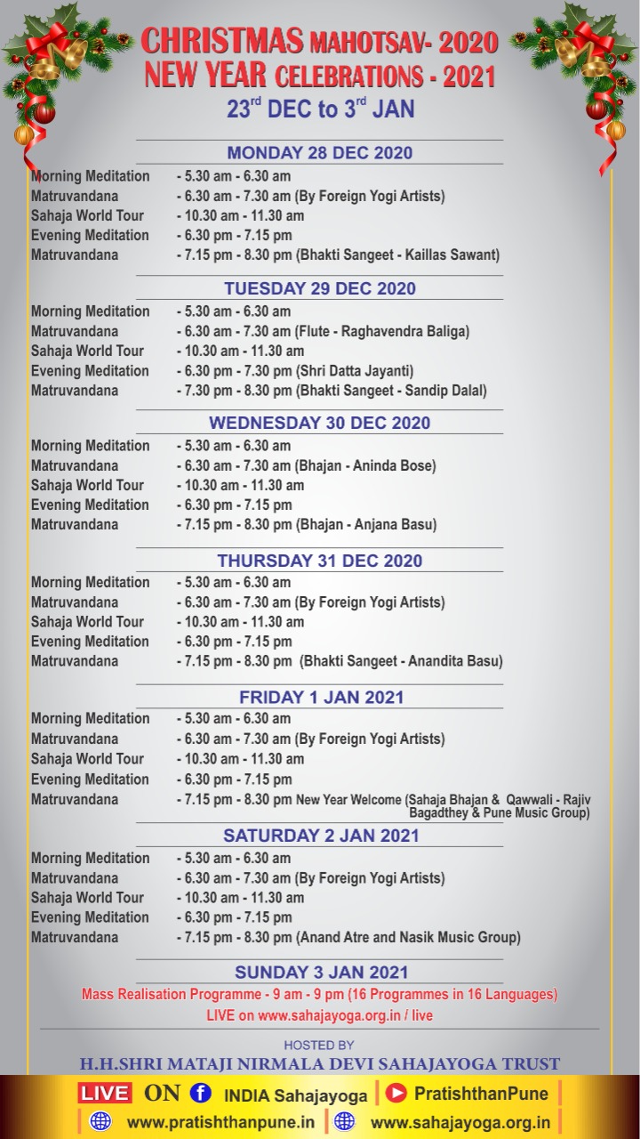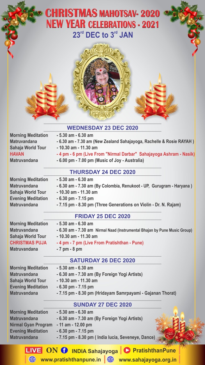 Please find enclosed a FLYER of CHRISTMAS PUJA MAHOTSAV 2020 & New Year Celebrations 2021, scheduled to be Broadcasted LIVE from Pratishthan, Pune from 23rd to 3rd January 2021.