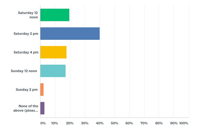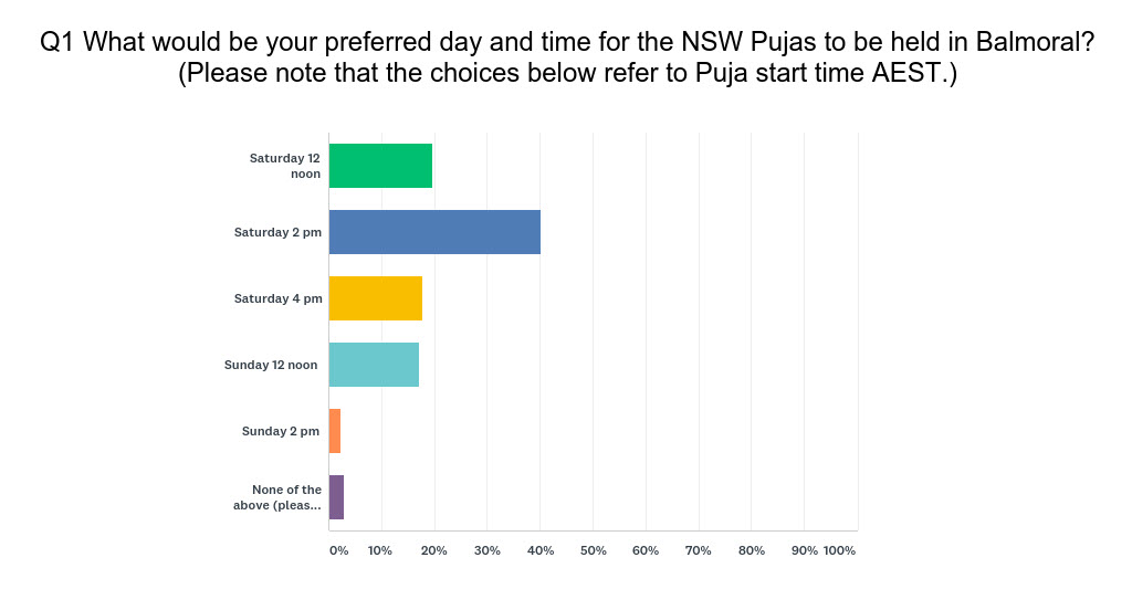 Thank you for participating in the survey for Puja day/time in Balmoral. The survey was sent to 500 email addresses in the NSW/ACT collective, and 269 responses were received. The majority (over 40%) of the respondents indicated their preference for Pujas to start at 2pm on Saturday. Please refer to the attached chart below for the breakdown of survey responses.