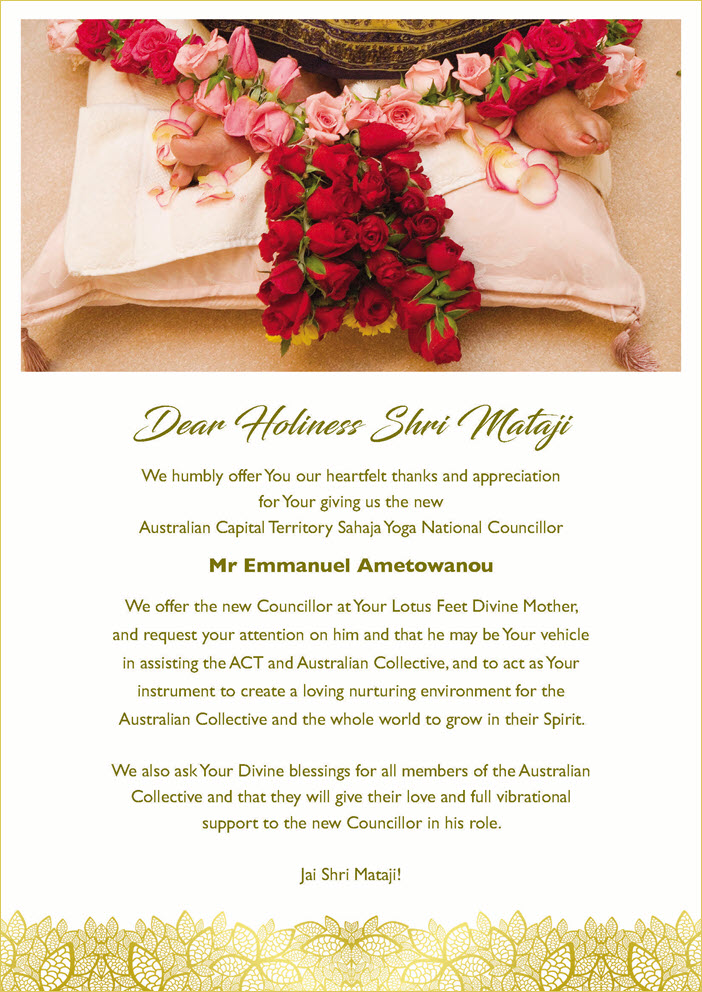 I’m pleased to announce that Emmanuel Ametowanou has been selected on vibrations by Shri Mataji to serve the Collective and our Holy Mother as our new National Councillor for the Australian Capital Territory.