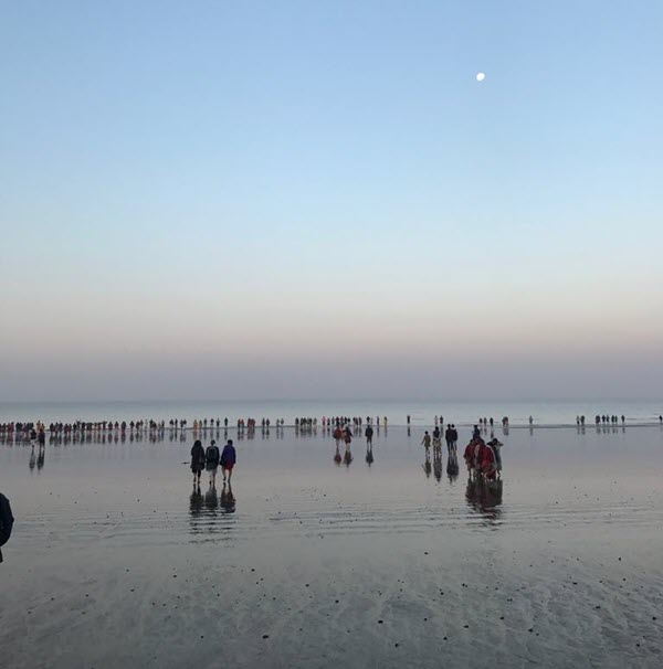 After meditation, the Australian yogis were asked to come forward to perform Aarti. After Aarti, many yogis came forward to offer flowers to Shri Mataji. By this time, the sun had begun to rise, and we made our way down to the beach for a foot soak. The tide was low, so we had to walk out about 100 metres through the cooling mud to reach the water. We said mantras to remove the heat from days, and days, of travelling and we felt completely cleansed.