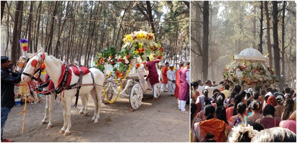 The next day was Puja Day. The Puja began with inviting Shri Mataji from the Nirmal Tree. Her Divine Lotus Feet were placed on a beautifully painted carriage covered in hundreds of flowers and drawn by two white horses. In front of the horses about 100 yoginis walked in single file carrying a basket with durva grass on their heads to herald the arrival of The Goddess. We walked slowly towards the Puja location, the men physically pushing the carriage along the sandy path. The experience was of biblical proportions, both timeless and placeless; it felt as if we had done this before many times throughout the ages, yet it still felt like the first time, somehow anchored in the present.