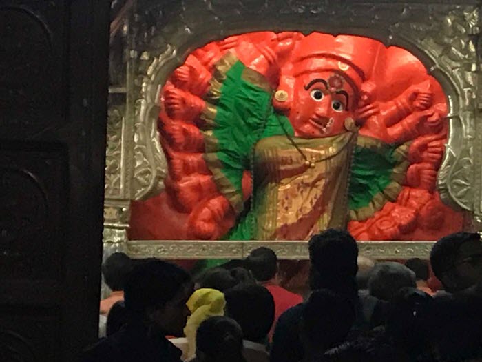 We woke from a short half hour sleep. We all were very tired from the previous day of a long bus ride from Nargol. All the Yogis wrapped up in shawls and made the slow trek through the dimly lit alley ways of Vaiduwadi at 4:30 in the morning. We all reluctantly gave our shoes to the shoe clerk and most of us took the stairs up to the Saptashringi temple.