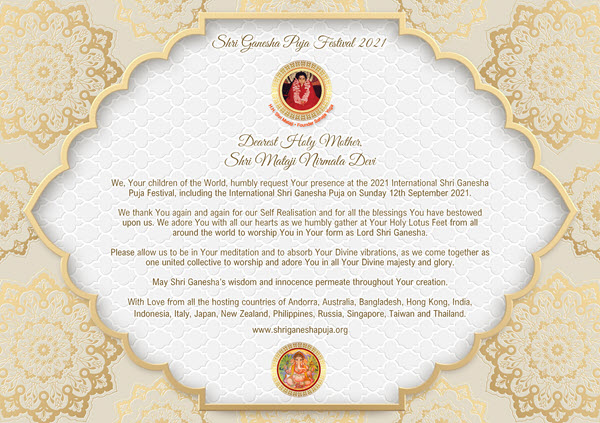 Please find below a link to the 2021 International Shri Ganesha Puja website and attached our humble invitation to Shri Mataji to be with us as we worship and praise our Holy Mother in Her form as Lord Shri Ganesha.