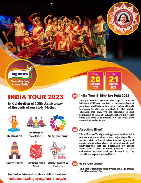 Please see the invitation from the Sahaja Yoga Trust of India to join the Indian Realisation Tour 2023 to coincide with Shri Mataji’s Centenary Birthday Celebrations. The Tour’s tentative dates are 20th January – 21st March 2023.