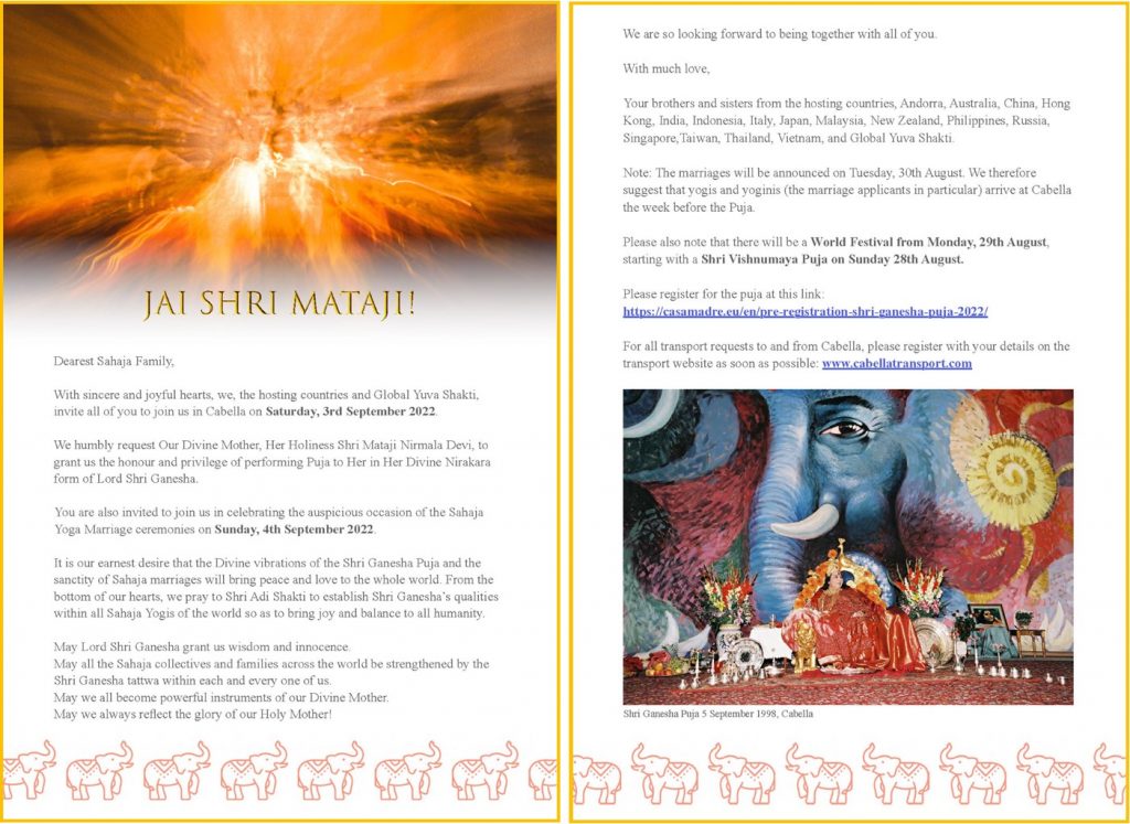 We humbly invite all the Sahaja Yogis of the world to join us in Cabella for Shri Ganesha Puja on Saturday, 3 September 2022 and Sahaja Marriage Ceremonies on Sunday, 4 September 2022.