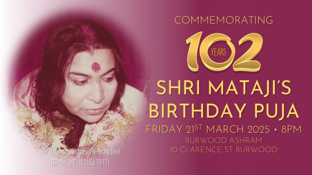 In the expression of our bhakti to our Divine Mother, Shri Mataji Nirmala Devi, all Yogis are invited to the Shri Mataji Birthday Puja at Burwood Ashram on Friday March 21st at 8pm. Everyone is cordially invited to Shri Mataji’s much love home, on this pure and holy land of Shri Ganesha
