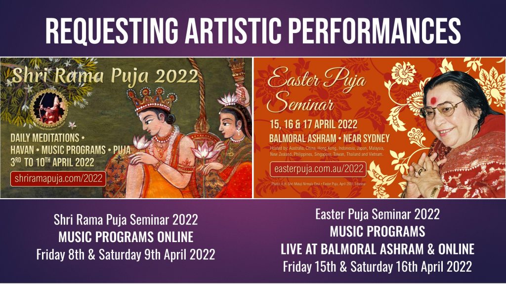 Artists are also invited to submit video performances for the online Shri Rama Puja and Easter Puja music programs.