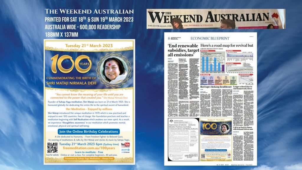 The announcement commemorating Shri Mataji’s 100th Birthday published in The Weekend Australian newspaper.