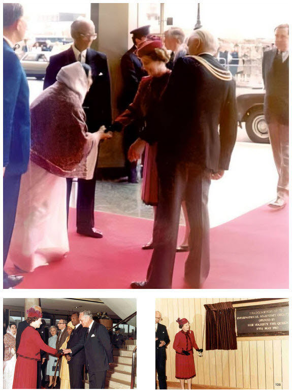 Queen Elizabeth II with Her Holiness Shri Mataji and Sir CP at the official opening of the Headquarters of the International Maritime Organisation in London 1983.