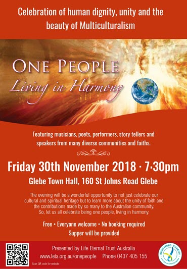 The evening will be a wonderful celebration of human dignity, unity and beauty of the multicultural fabric that makes Australia one of the greatest countries in the world. We celebrate the coming together of many people of diverse communities and faiths that have so enriched our country. This very special event will feature musicians, poets, performers, story tellers and speakers from many of these diverse communities and faiths.