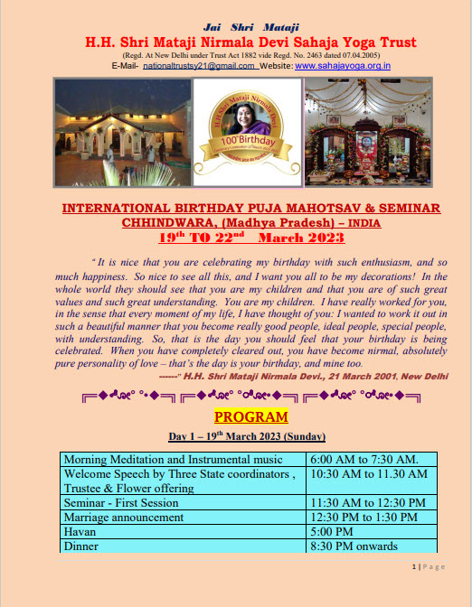 From H.H. Shri Mataji Nirmala Devi Sahaja Yoga Trust – New Delhi