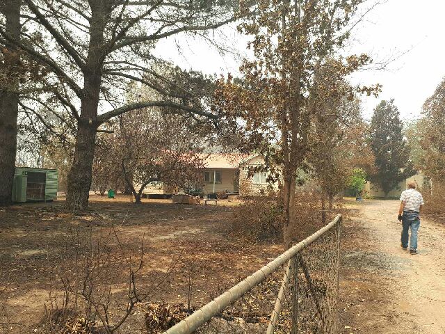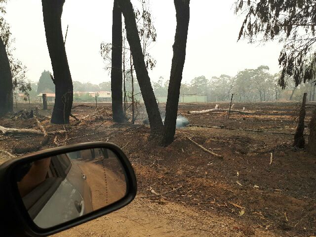 This morning Simon, the Yogi caretaker from Balmoral Ashram, was allowed for a short time to drive near to the Ashram and amongst a blackened field and the surrounding native vegetation which has been badly burnt Shri Mataji’s Cottage and the Puja Hall are untouched by the fires.