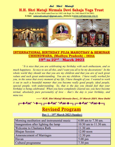 By the Grace and Blessings of our Most Beloved Divine Mother, the ‘100th International Birthday Puja & Seminar-2023’, is scheduled to be held at Chhindwara (M.P) from 19th to 22nd March 2023.