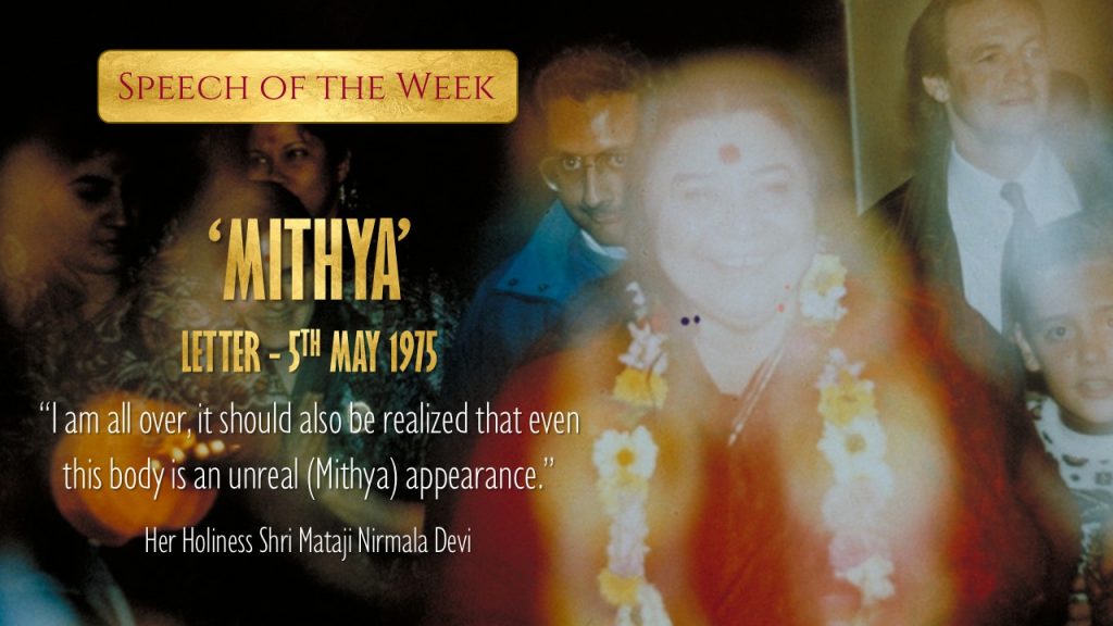 “If you understand that although my physical being is here I am all over, it should also be realized that even this body is an unreal (Mithya) appearance. It is difficult to come to this stage but if gradually unreal is discerned, the truth will be established effortlessly and waves of great bliss will envelop your being. I am explaining, in this letter, what is unreal (Mithya). It should be read out to all and assimilated by all.” Shri Mataji