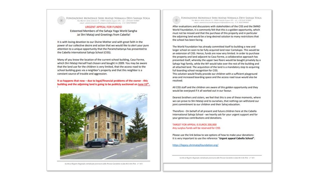 Please see below an urgent message and letter from the Sahaja Yoga World Foundation regarding an opportunity to purchase a property adjacent to Cabella International Sahaja School (CISS).