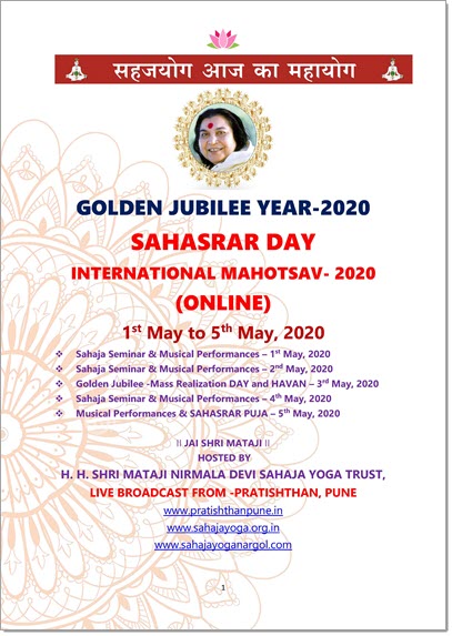 By the Grace and Blessings of our DIVINE MOTHER ADI SHAKTI MATAJI SHRI NIRMALA DEVI we along with world collective wish to join together for an on line GOLDEN JUBILEE CELEBRATIONS & INTERNATIONAL SAHASRAR PUJA 2020 from 1st to 5th May 2020. The program Circular is enclosed.
